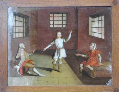 Tres figuras masculinas en un espacio interior con tres ventanas. Dos ...
