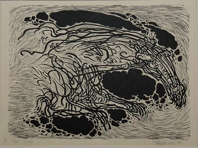 Obra en formato rectangular, vertical. Composición monocromática, en b...