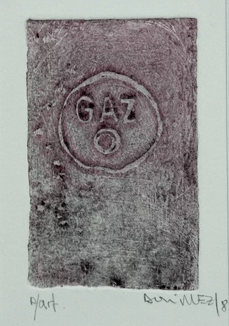 La obra también presenta por el anverso impresión. En la esquina superior derecha, un grupo de figuras puetas en diagonal, bajo eso un texto escrito en letra imprenta, de color verde