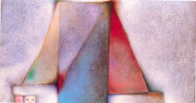 Composición formada por figuras triangulares de grises, verdes y rojos...