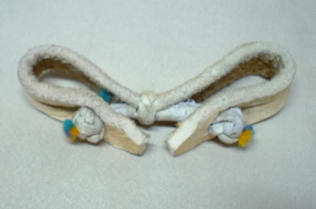 Objeto exento de color marfil, que representa esquemáticamente una figura masculina frontal de pie, con cabeza de forma romboidal y con las manos cruzadas sobre el pecho.