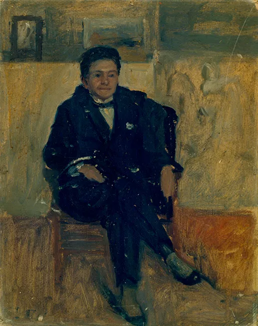Obra de formato rectangular. Composición en base a personaje masculino de cuerpo completo en tonos celeste, lila y marrón; sentado con las piernas cruzadas, con la mano izquierda sostiene un cigarrillo cerca de la boca y con la mano derecha un bastón, lleva sombrero. Fondo en tonos azul, gris y rojizo.
