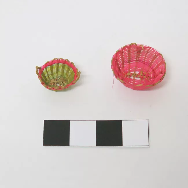 Objetos de uso decorativo. Conjunto de cuatro objetos redondos.Tienen un orden decreciente, son de color natural sin teñir y llevan un borde de color rojo. Elaborados en una estructura de ixtle sobre la cual pasa el tejido de crin.