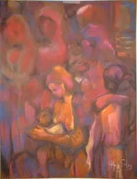 Obra de formato rectangular vertical. La imagen corresponde al retrato de una mujer de edad adulta, vista de semi perfil izquierdo. Ella posee piel clara, pelo negruzco y corto, ojos oscuros, nariz recta, boca con labios cerrados y mejillas rosadas; viste atuendo negro. El fondo es color grisáceo. Pintura aplicada con pinceladas anchas y aguadas.