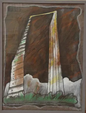 Obra de formato rectangular. Composición en base a valle con casas, laderas de cerros y montañas nevadas, tonos amarillo, marrón, verde, azul, celeste y blanco. Marco blanco con gris.