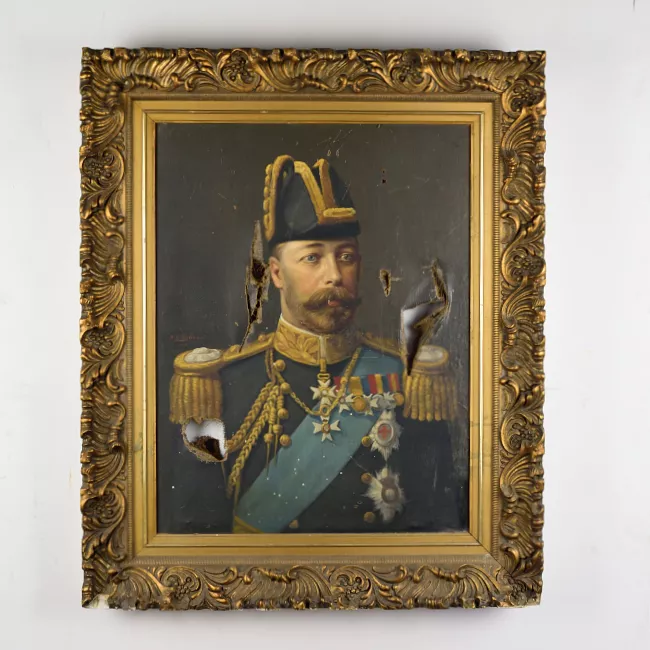 Obra de formato rectangular vertical, de estilo figurativo esquemático. En ella se aprecian dos figuras humanas paradas, delineadas en color blanco. La figura de la izquierda tiene el torso semi inclinado hacia su derecha y los brazos delante del cuerpo, mientras la pierna derecha la tiene doblada y la izquierda estirada. La figura de la derecha parece ser mujer por llevar vestido largo, con su torso semi inclinado hacia su derecha. En la parte inferior de la obra, tras las figuras, aparece la cabeza y los hombros de otro personaje. Los tonos usados para pintar el fondo e interior de las figuras con azules y celestes, aplicados con pinceladas cortas en diversos sentidos. El marco es un rodón de madera natural.