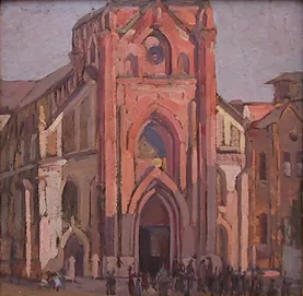 Obra de formato cuadrado. Composición formada por un paisaje urbano, f...