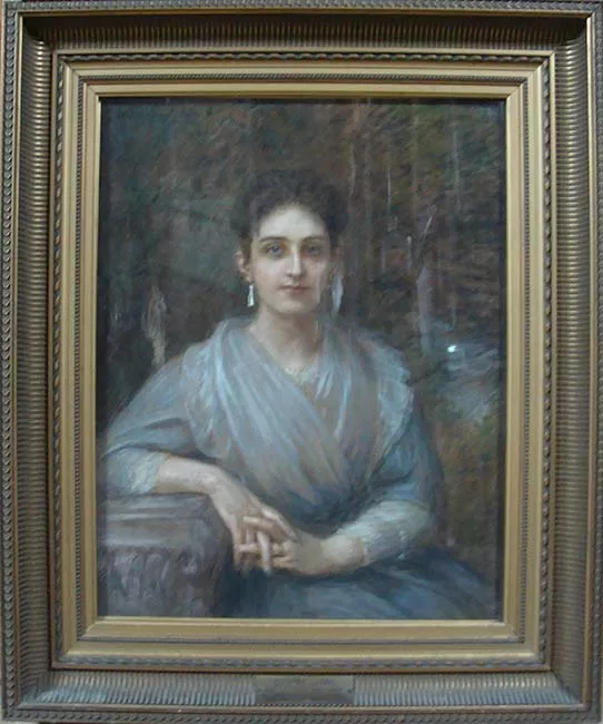 Figura femenina vista de tres cuartos. La mujer viste blusa rosada con mangas abullonadas y encaje blanco, cinturón marón y falda gris. Tiene el cabello recogido en un moño y con ambas manos sostiene un libro abierto. En el fondo hay árboles y follaje.
