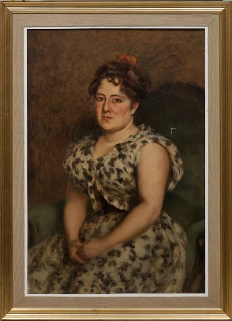 Obra de formato rectangular. Composición en base a retrato femenino de...