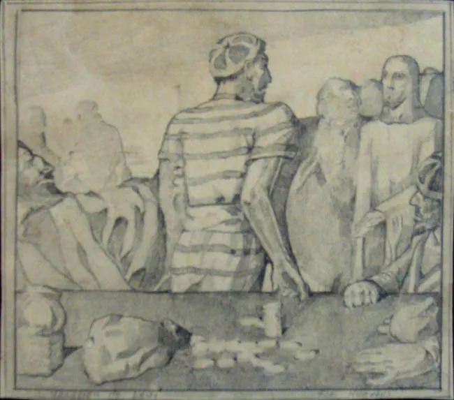 Dibujo monocromo que representa una vista a lo lejos de un conjunto de...