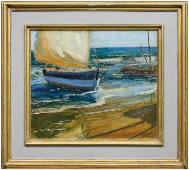 Obra de formato rectangular. Composición en base a un bote de vela de ...