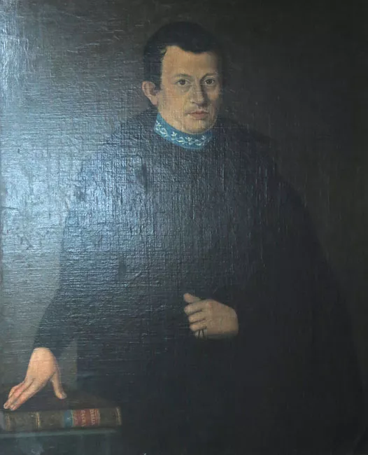 Figura masculina de tres cuartos de cuerpo. Vestido con hábito religio...