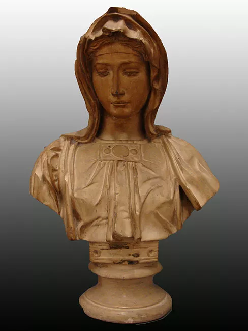 Obra tridimensional, exenta. Escultura de busto femenino, con velo y t...