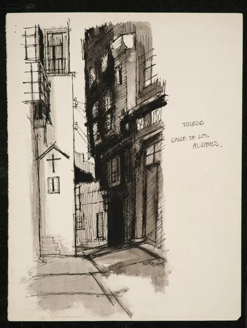Dibujo de una calzada con sillares y edificios a sus lados. En el lado...
