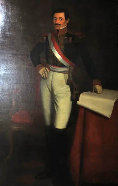 Personaje masculino de cuerpo completo, viste uniforme militar con cha...