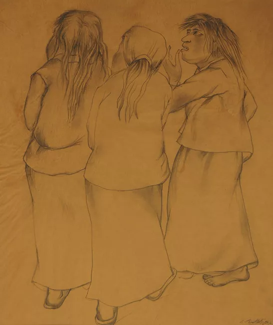 Obra en formato rectangular en posición vertical. Composición abstracta formada por varias figuras curvas y de borde suaves, en tonos amarillos, rosas, y naranjas, combinados con verdes y azules, con partes de ojos, bocas y dientes. En la parte superior izquierda, hay una figura con una cabeza grande, ojos inclinados, y lo que parece ser un bigote curvado. A la derecha, otra figura sonríe ampliamente, mostrando dientes, con ojos redondos y una forma ondulada alrededor de la cabeza. En el centro de la imagen, hay varios elementos dispersos: un ojo grande, una figura con forma de ave, un rostro con gafas y ojos detallados. Al fondo, se ven pequeñas formas de árboles en la parte inferior, mientras que en la parte superior hay espirales de colores y siluetas de figuras humanoides. A la derecha, un sol amarillo está parcialmente visible. La imagen tiene una firma en la esquina inferior derecha.