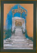 Composición rectangular en formato vertical. En primer plano estatua e...