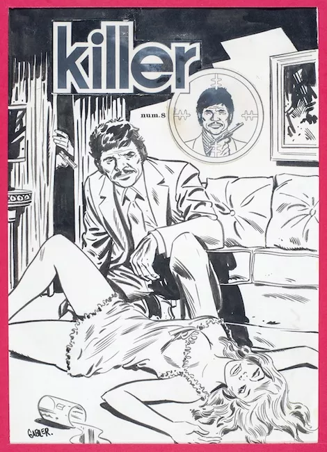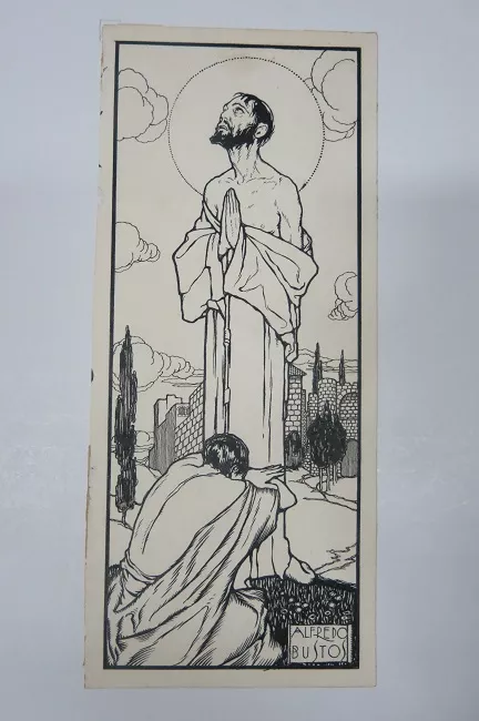 Dibujo monocoromo. En primer plano, personaje masculino barbado con la...