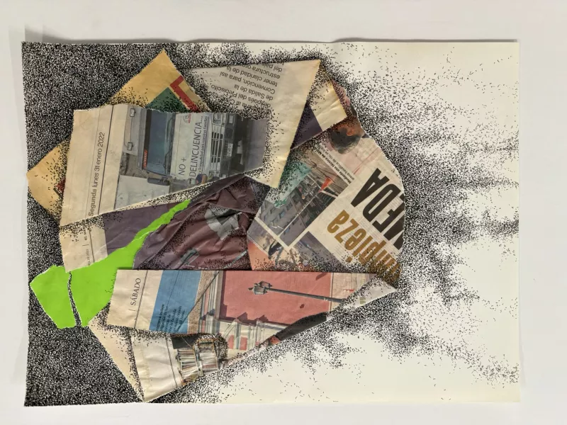 Obra de formato rectangular y orientación horizontal. Composición en base a grupo de figuras humanas jugando al ajedrez. A la izquierda hay cuatro figuras de perfil observando un tablero que extienden sus brazos y tienen peones en sus manos. A la derecha, una figura de perfil con bigote y gafas en igual posición. Detrás de esta se observa la silueta de otra figura. Al centro y sobre todas las figuras se extiende un tablero de ajedrez ondulado con nueve fichas sobre su superficie. En la parte superior, seis círculos que representan el ciclo lunar. Las figuras son todas calvas. La obra está realizada con delgados trazos negros y series de líneas entrecruzadas en mayor o menor medida que le otorgan variaciones de grises.