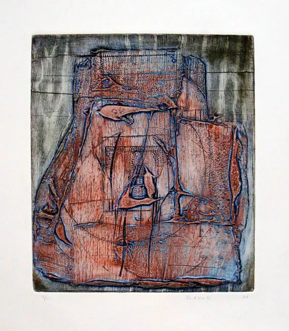 Obra de formato rectangular de orientación vertical. Grabado figurativo compuesto por señales geométricas; al centro superior un triángulo rojo con un signo de exclamación en el interior y bajo ella una línea recta de franjas diagonales amarilla y naranja.