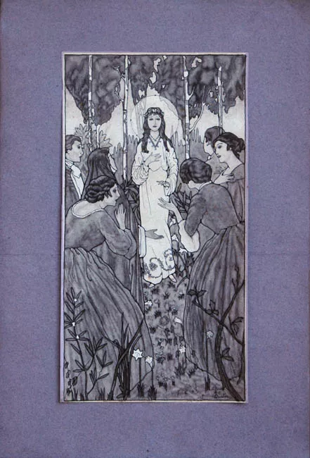 Obra rectangular, orientación vertical. Retrato de medio cuerpo, perfil derecho de figura femenina con el torso desnudo. La mujer tiene el cabello castaño y semi recogido. Tras ella un ramo de lirios. Fondo azul. Toda la obra esta conformada por pequeños fragmentos como mosaico.