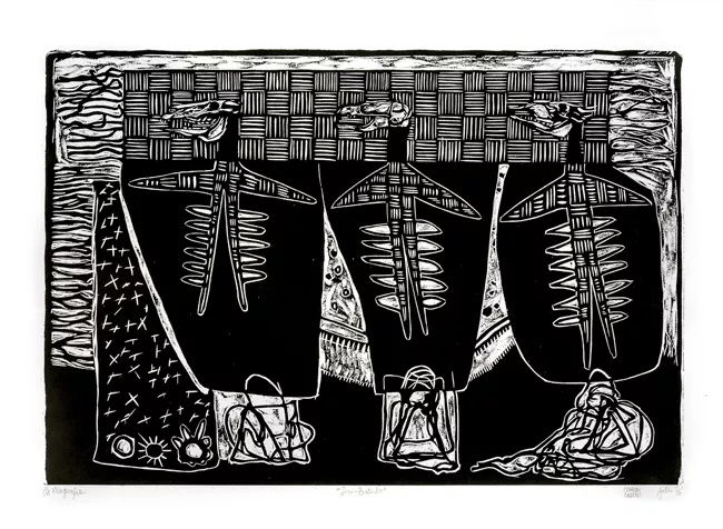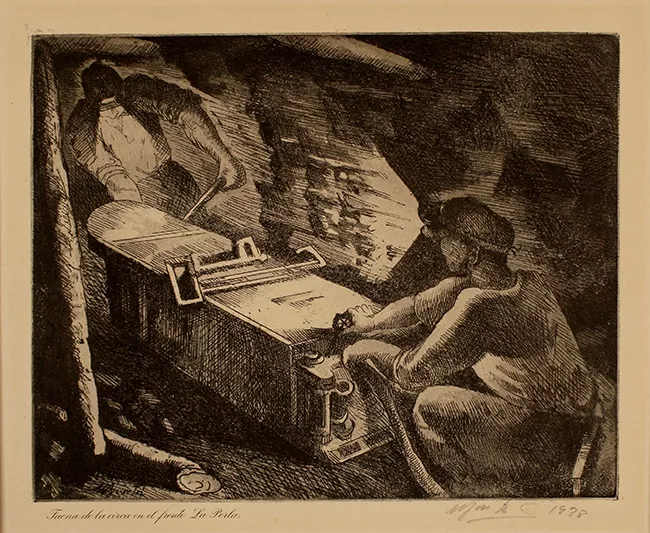 Obra de formato rectangular, horizontal. Composición monocromática, en...