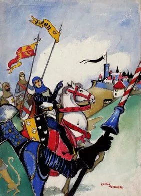 Obra de formato rectangular de orientación horizontal que representa dos caballos blancos dentro de un aro o círculo de contorno color amarillo oscuro. El dibujo se enmarca en un cuadrado amarillo sin mayor contexto.