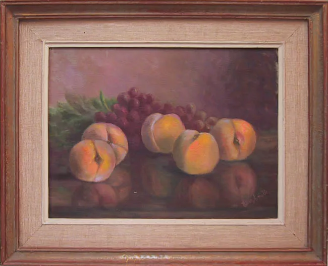 Obra de formato rectangular. Composición en base a cinco duraznos dela...
