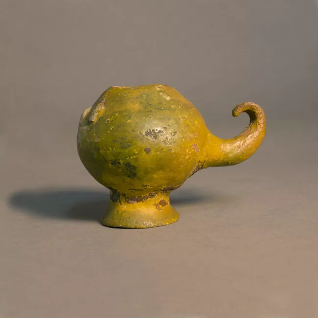 Objeto decorativo, volumen cilíndrico, representa una flor, copihue, de importantes pétalos longitudinales que descansa sobre unas hojas. Esta esmaltado completamente transparente en la superficie.