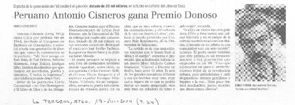 Peruano Antonio Cisneros gana Premio Donoso [artículo] Andrés Gómez B...