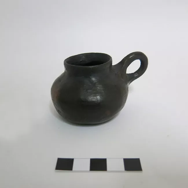 Objeto decorativo, representa un caballo robusto, de pie construido en formas abultadas y esquemáticas; al extremo superior presenta la cabeza recogida junto al cuello, el cuerpo es abultado y la cola pende junto a las patas. Al extremo inferior tiene cuatro patas alineadas y se eleva sobre una base breve rectangular. Esta esmaltado de color rosa oscuro y una mancha ocre en el lomo.