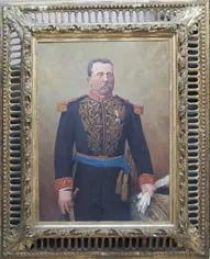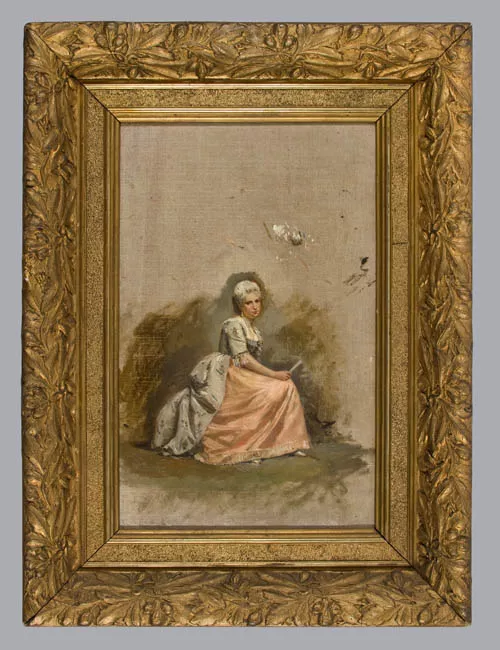 Obra de formato oval y disposición vertical. Retrato femenino de torso, sedente. Se trataría de una mujer artista en vista de los elementos que la acompañan. La joven está sentada frente a un lienzo, aunque mira al espectador. Tiene rostro juvenil muy iluminado, de tez blanca, con cabello castaño rizado y recogido. Viste un traje blanco de corte imperio. En su brazo izquierdo sostiene una paleta de pintor y pinceles. Atrás como fondo un boceto al carboncillo de una mujer con túnica que deja a la vista el hombro a la izquierda. Esta firmado en costado derecho.