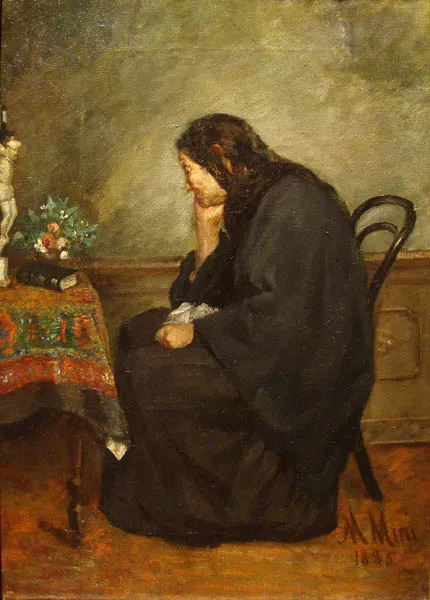 Composición vertical, retrato de tres cuartos de cuerpo, perfil a la izquierda de personaje sedente. Viste traje de chaqueta color azul oscuro, camisa blanca con vuelos y lazo blanco en el cuello. Cabello oscuro corto y liso, cejas marcadas y oscuras, mira a la izquierda. Tiene prendida en la solapa ancha de la chaqueta, la medalla de la Orden al Mérito de Chile. Está sentado en una silla de madera de respaldo alto, en que se ven los botones o remaches al costado y una bola como remate. Al lado izquierdo hay un escritorio que tiene un libro abierto y otros parados en posición vertical. Su antebrazo derecho descansa sobre el escritorio y con la mano izquierda sostiene un documento.