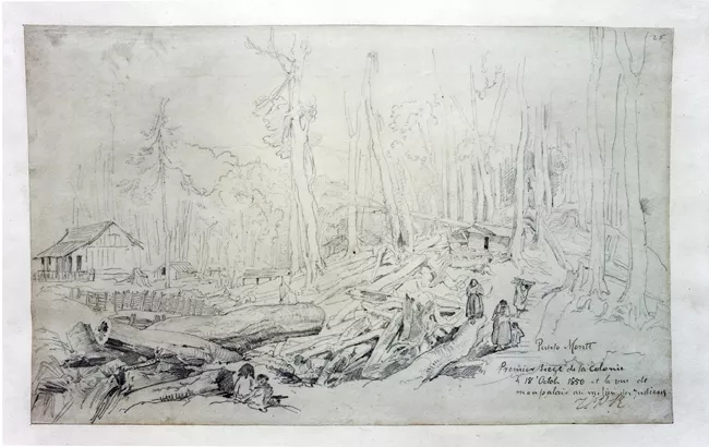 Composición rectangular en formato vertical. En la zona alta de una formación rocosa, se ve una construcción de madera con techos de dos aguas. la parte frontal está abierta.