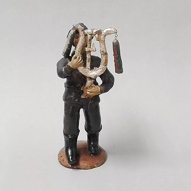 Objeto decorativo, representa una mujer de pie frente a caño de agua. ...