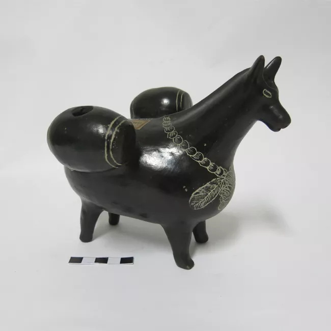 Figura zoomorfa de volumen globular y color negro; al extremo superior...