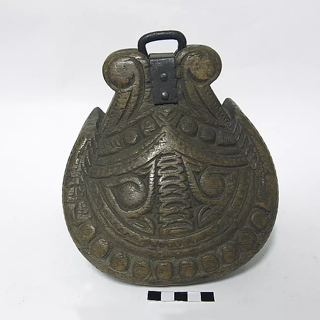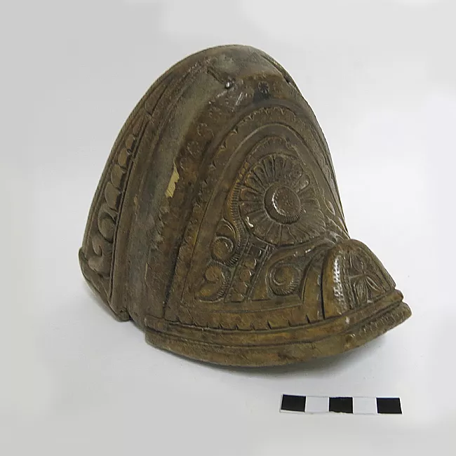 Objeto de madera que se usa en pares para sujetar el pie a la montura. Tiene forma de caja con base redondeada y la zona inferior frontal en forma de media luna con decoraciones incisas en base a semicircunferencias y adornos tallados. La parte superior lleva un agregado que remata en un anillo. La zona posterior inferior está calada para introducir el pie.