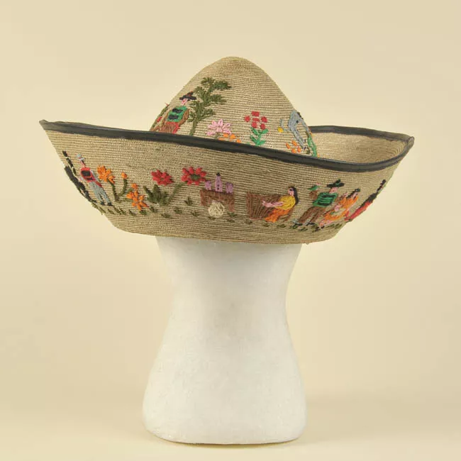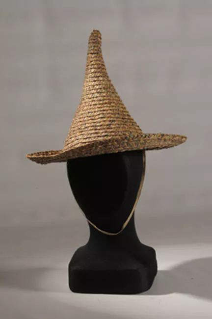 Sombrero de paja de teatina tejida, su forma imita al bonete huicano,...