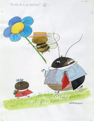 Composición rectangular. Vemos tres personajes antropomorfos: un abejo...