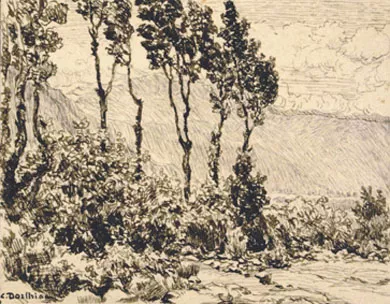 Composición que representa un paisaje con camino bordeado por vegetaci...