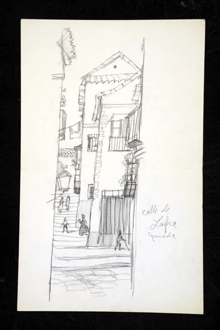 Dibujo de una vista de una plazuela con edificios y casas a sus lados ...