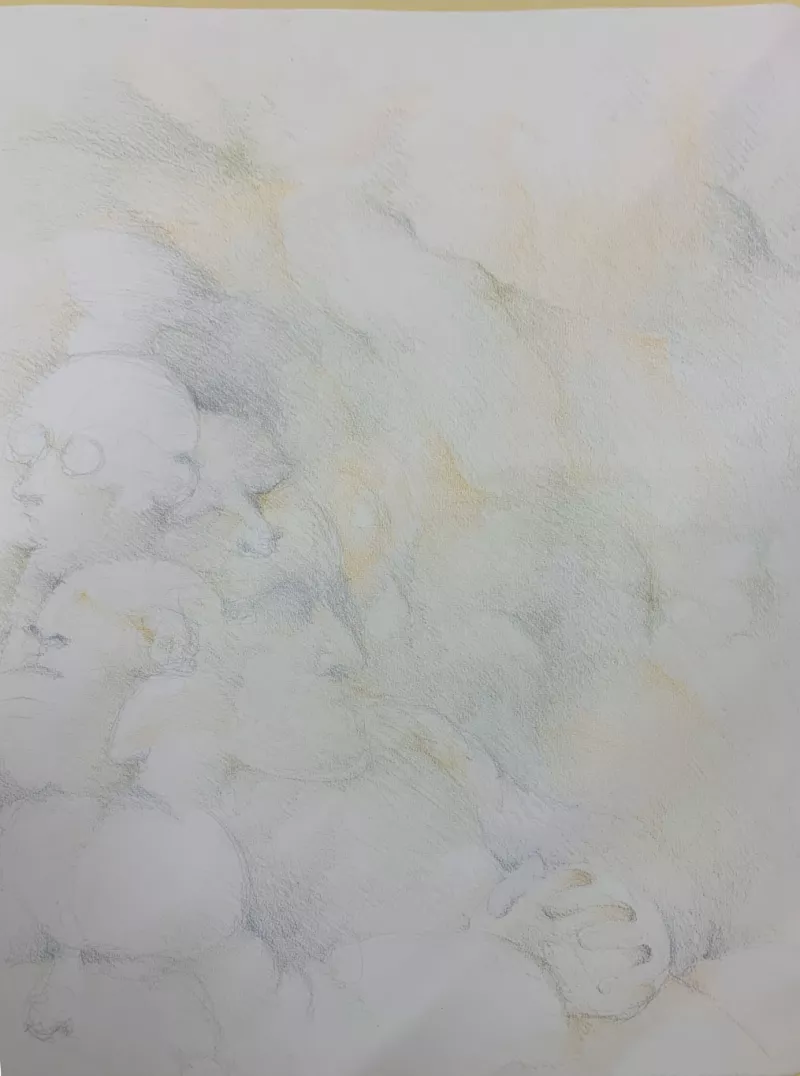 Obra visual en formato rectangular y disposición horizontal. Dibujo mo...