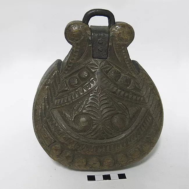 Objeto en forma de caja que se usa en pares para sujetar el pie durante la cabalgadura. Posee base redondeada y la zona inferior frontal en forma de media luna con decoraciones incisas en base a semicircunferencias y adornos incisos. La parte superior lleva un agregado que remata en un anillo. La zona posterior inferior está calada para introducir el pie.
