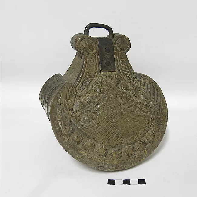 Tanto en la parte frontal como en los costados presenta decoraciones en base a botones y guardas en relieve. La base en la zona trasera es plana, curvándose hacia arriba en la zona de la punta.