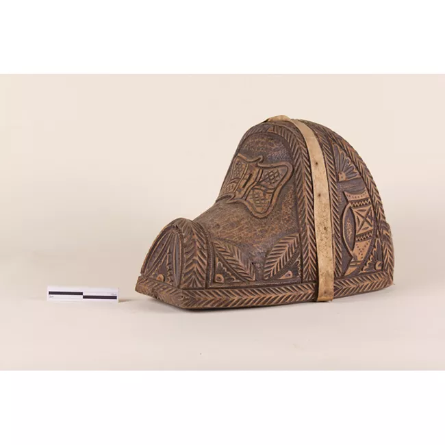 Objeto de madera semejante a un zapato. En su parte delantera termina en una punta truncada, mientras que por el lado posterior posee una cavidad para introducir el pie.