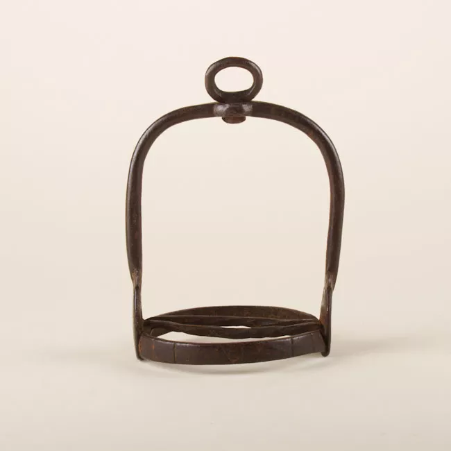 Objeto utilitario. Usado para sostener el pie durante la cabalgadura. Está compuesto por una estructura en forma de arco con dos brazos que se sostienen sobre una base que sirve de apoyo para el pie llamada hondón y que esta calada en forma de rectángulo. En la parte superior un rectángulo calado para la arción.