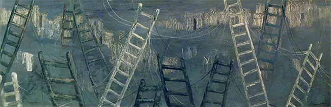 Obra de formato rectangular. Composición en base a paisaje urbano comp...