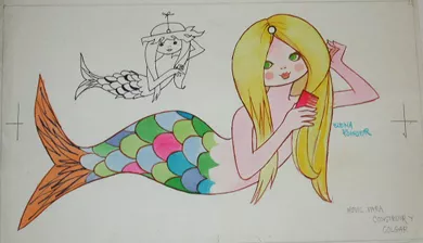 Obra visual de formato rectangular y disposición vertical. Dibujo policromado. En el primer plano de la composición una figura femenina de cuerpo completo sosteniendo un instrumento. De fondo, cuatro viñetas protagonizadas por figuras femeninas y masculinas.