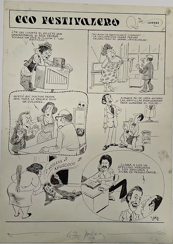 Obra visual en formato rectangular y disposición vertical. Dibujo monocromo. Está compuesto de cinco viñetas protagonizadas por figuras humanas y zoomorfas. Tiene diferentes números al interior de círculos irregulares para indicar o sugerir colores.
