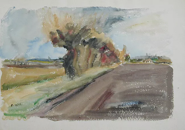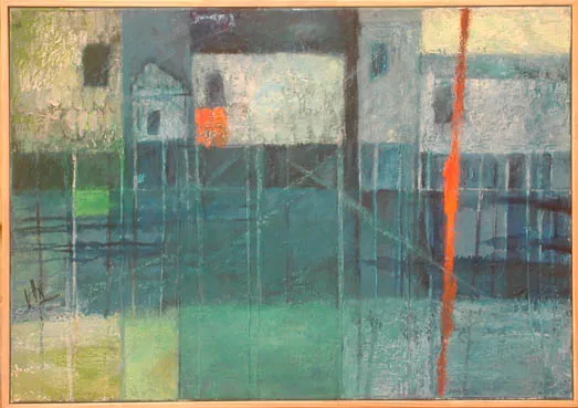 Obra de formato rectangular, vertical. Composición en base a jarrón de...